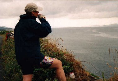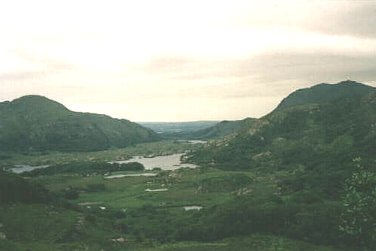 Irland 1995 Freitag, 07.07.1995 von Killorglin nach Kenmare, 61,3 km (Tagebuchauszug) 7.00, das schon fast Alltägliche hier in Irland, wir werden von strömenden Regen begrüßt, als wir die Nase aus dem Zelt stecken. (Wundert mich im Nachhinein, dass wir nach der dreiwöchigen Tour nicht mit Schwimmhäuten zwischen Fingern und Zehen zurückgekehrt sind J ) Aber was soll's? Wir müssen und wollen weiter. Außerdem fühlen wir uns nach dem gestrigen erholsamen Nachmittag ausgesprochen tatendurstig. Als wir um 9.15 vom Platz rollen, hat sich der strömende Regen in "ein-Tropfen-kein Tropfen-Regen" aufgebessert. In voller Regenbekleidung düsen wir mit 20 km/h los. Nach einiger Zeit hört es auf zu regnen. Die Sonne kommt raus und schon ist es drückend warm und schwül. So ist es nun mal in Irland. Entweder Regen (nur zweimal am Tag ist schon prima Wetter), oder schwüle Wärme, die einem den Atem nimmt, wenn es dann mal wieder einen der vielen Berge in der Küstenregion hochgeht. Nach und nach legen wir die trockengeradelten Regensachen ab.