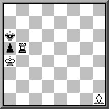 Daher 1. Kf7! b5 2. Sc8 (droht 3.e7 4. Ke6 5. Sd6 matt) h5 3. e7 Kd5 4. L:f3+ Kc5 5. Ld6
